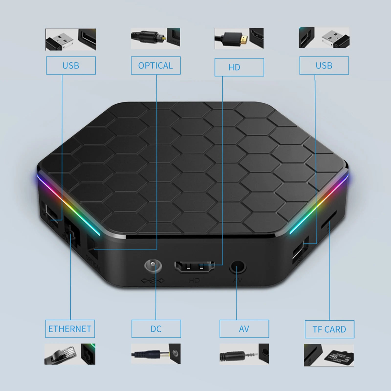 I/O Port: USB 2.0, TF Card Slot, RJ45, Power Input, HD 2.0, AV, OPTICAL